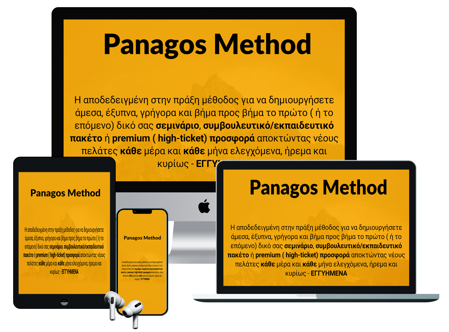 Στην μέθοδο μου “Panagos Method”, αποκαλύπτω βήμα προς βήμα και από το Α στο Ω, ΟΛΑ όσα χρειάζεται να γνωρίζετε και να κάνετε προκειμένου να μπορείτε να κερδίζετε περισσότερα κάνοντας λιγότερα, έχοντας όσους νέους πελάτες εσείς θέλετε κάθε μέρα και κάθε μήνα για τα σεμινάρια, τις υπηρεσίες ή τα πακέτα σας... απολαμβάνοντας ταυτόχρονα ηρεμία, έλεγχο και προβλεψιμότητα και πολλές περισσότερες διακοπές με την οικογένεια και τους αγαπημένους σας